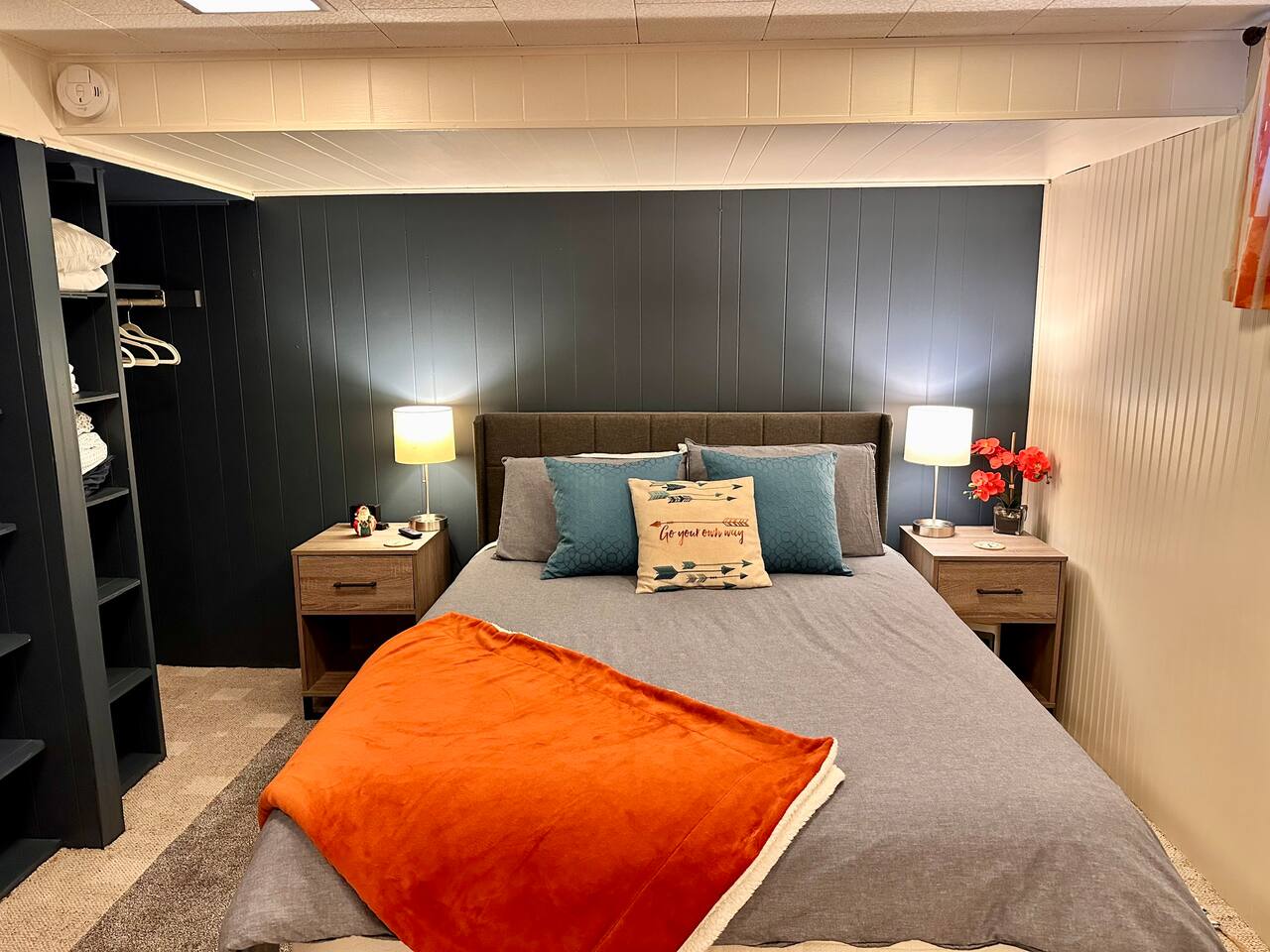 Welcome to our cozy downstairs guest space with a private entrance or access through the main living area. Enjoy a theater-style living room with a luxury reclining couch, 65” TV, and surround sound. Your space includes two bedrooms, a full bathroom, and a kitchenette.
