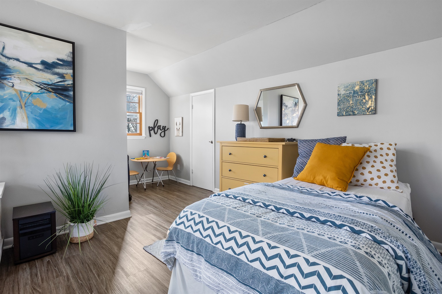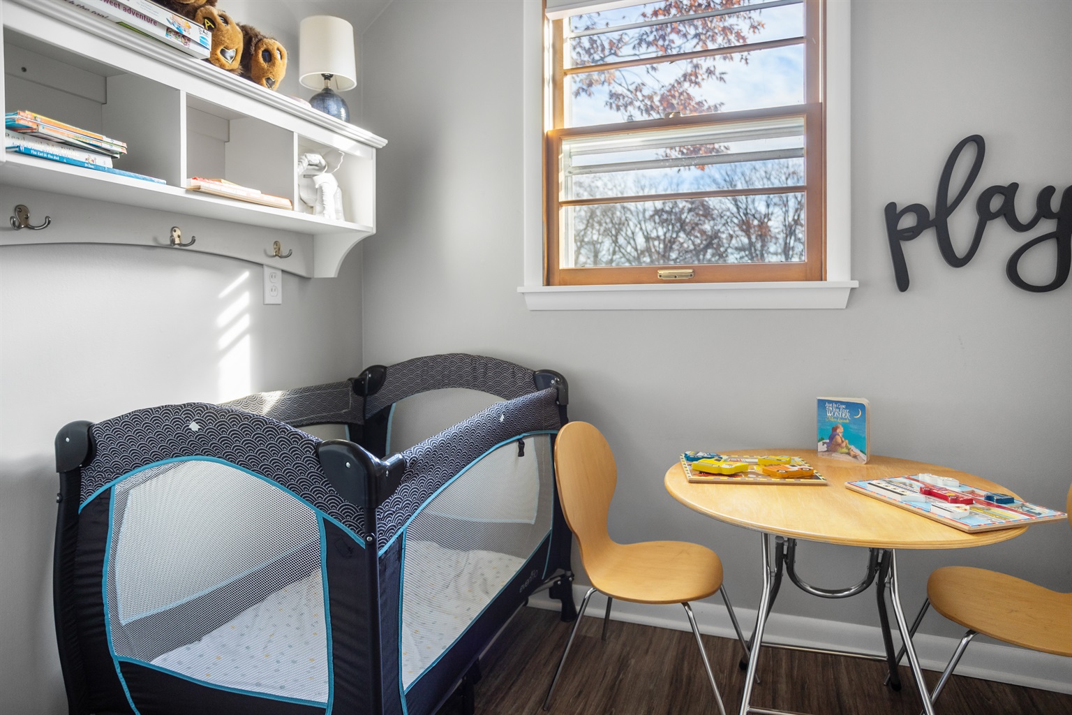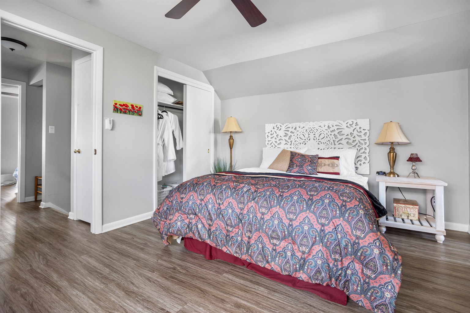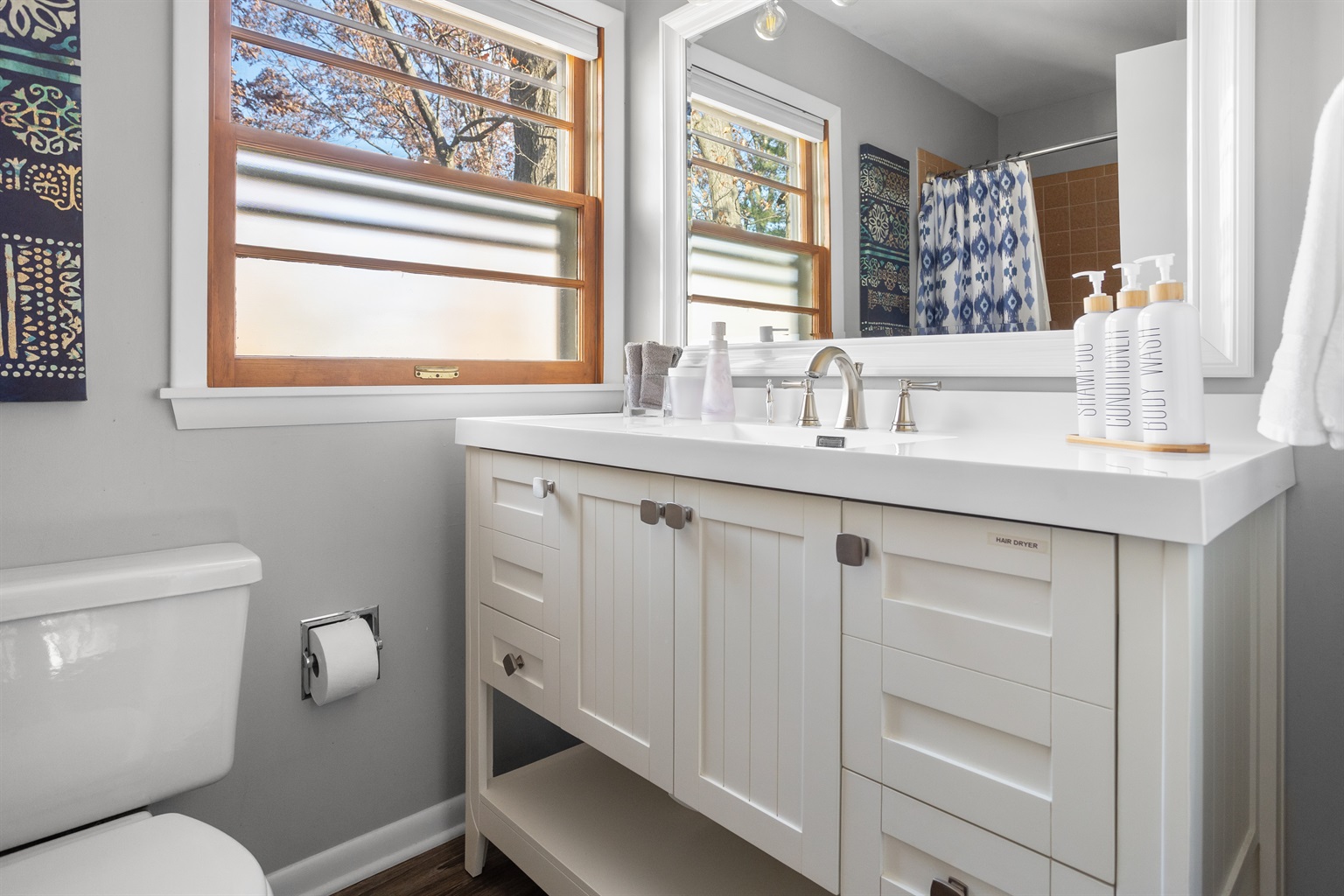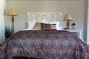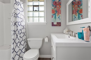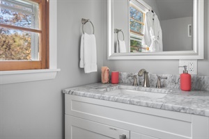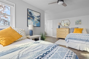 3 Bedrooms • 3 Bathrooms 3 Baths • Sleeps 4-6--Property Highlights: 3 Bedrooms, 3 Bathrooms: Our spacious home comfortably accommodates 1 to 6 guests. The main floor features a large queen bedroom with a workspace and a private bath. Upstairs, you'll find a generously sized en suite queen bedroom and a double twin XL bedroom with play space and an adjacent bath.